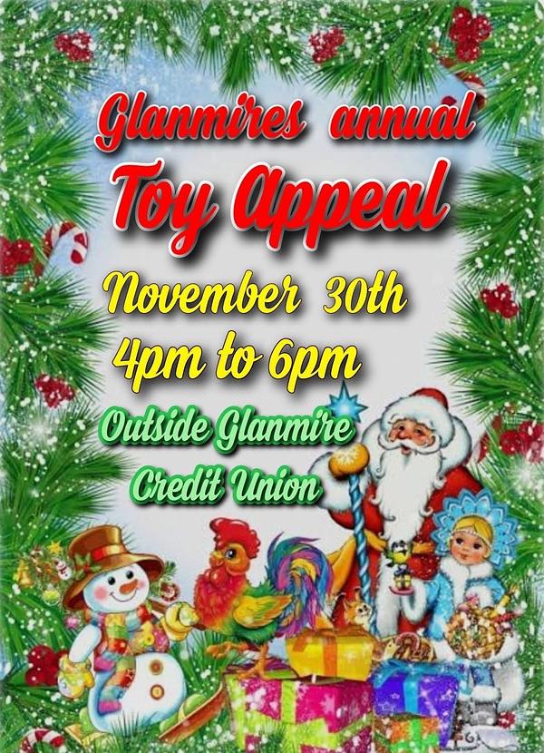 Glanmire's Annual TOY APPEAL (running 30 plus years thanks to Ursula, Chris & team) will be collecting toys for those in need, in our area, on the 30th November outside Elevate Credit Union Glanmire. NEW toys would be much apprieciated . Anna from Uparty has also agreed to accept donations for those who can't make the day.