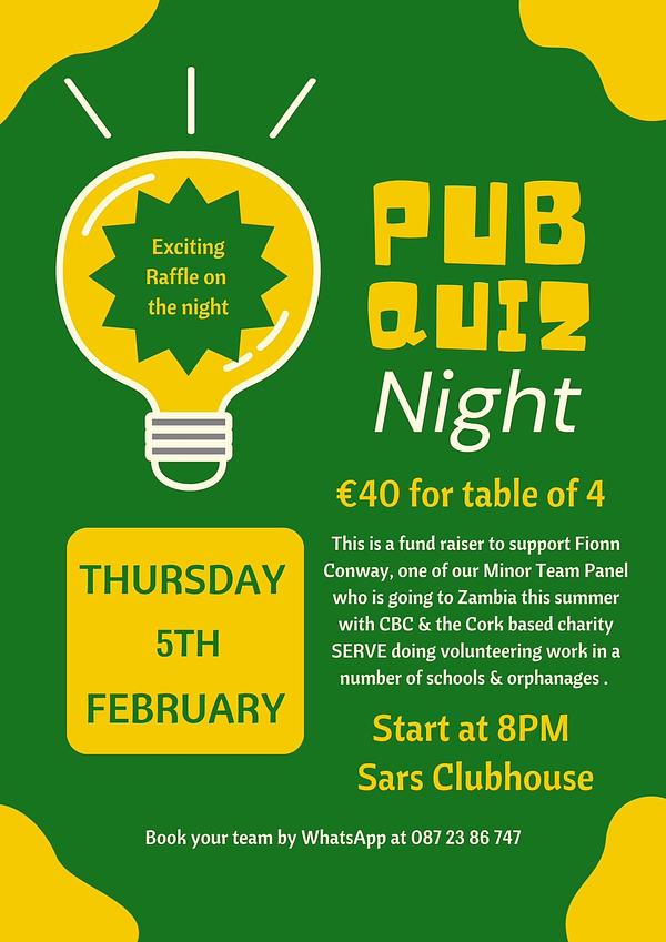 Fionn is travelling to Zambia in June, to volunteer in local schools and orphanages π As part of his fundraising endeavours, he is organising a Pub Quiz Sarsfields Hurling Club.